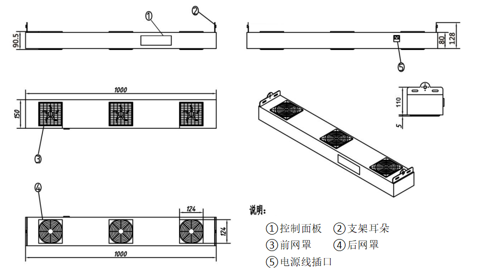 1000mm(L)*150mm(W)*80mm(H)(不含支架耳朵) |