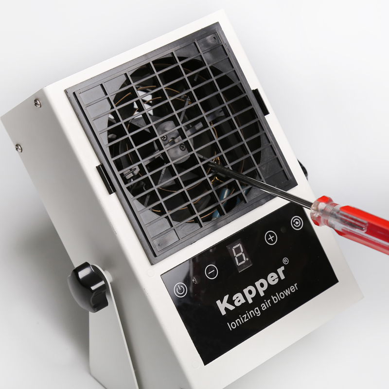 KP101B第5代智能型臺式離子風機可產生大量的帶有正負電荷的氣流,可以將物體上所帶的電荷中和掉。當物體表面所帶為負電荷,它會吸引氣流中的正電荷,當物體表面所帶為正電荷時,它會吸引氣流中的負電荷,從而使物體表面上的靜電被中和,達到消除靜電的目的。