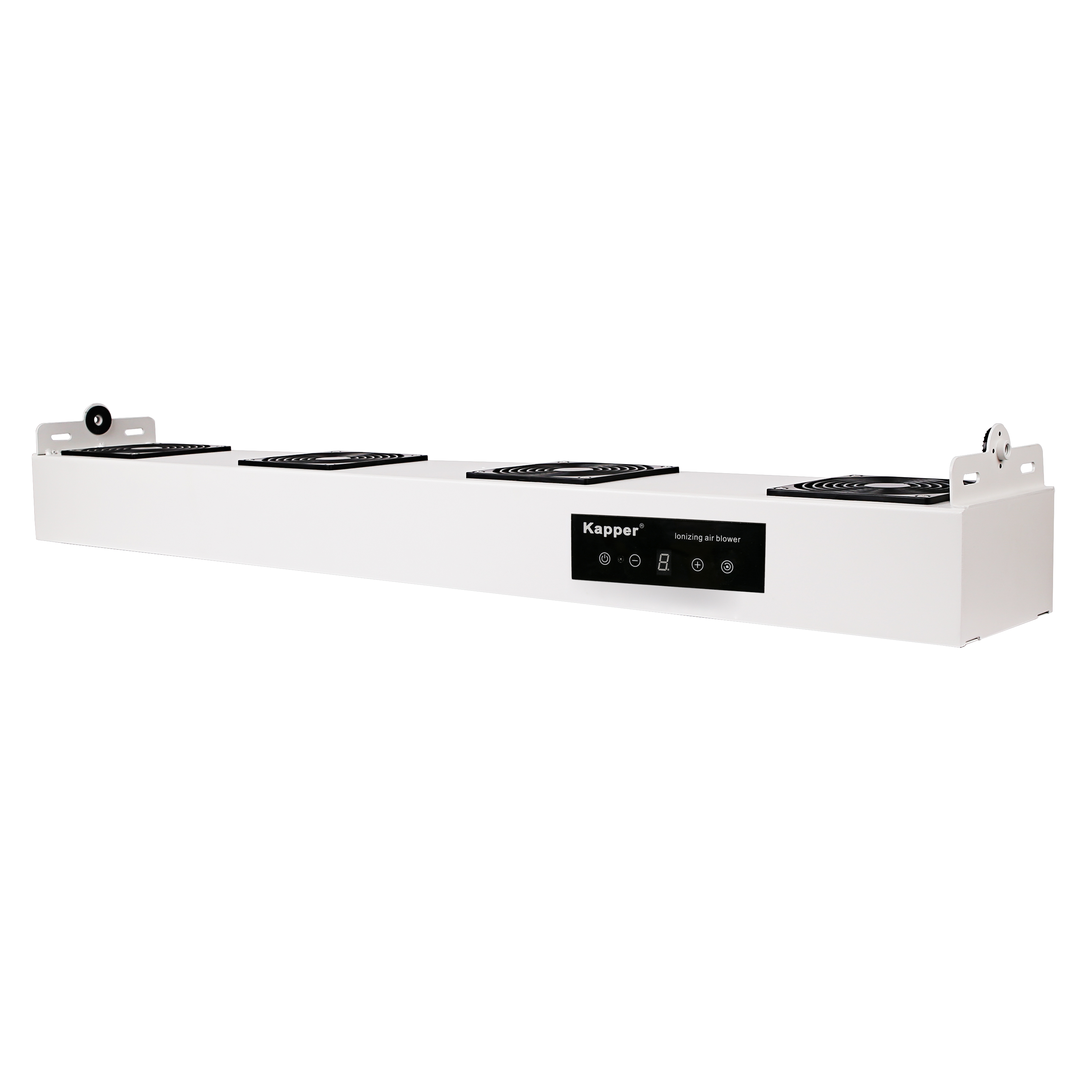 KP104A第5代智能型懸掛式四頭離子風機是卡帕爾公司新研制生產的消除物體表面靜電的智能型除靜電裝置。